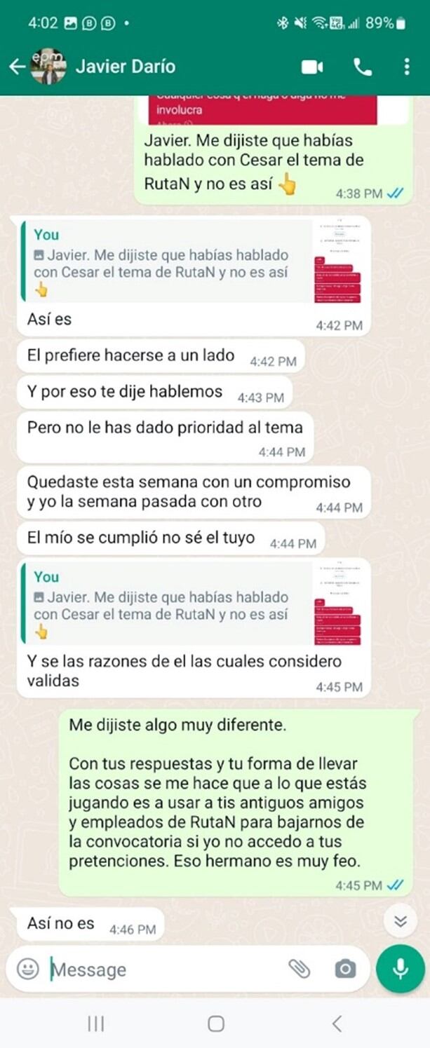 Paralelo a esto, hay pantallazos de conversaciones con fecha del seis de julio de 2021, entre Juan Pablo Durán y Javier Fernández, que nada tenía que ver con RUTA N, en los que este último le pide de manera insistente que se reúnan previo a la adjudicación de esos contratos.