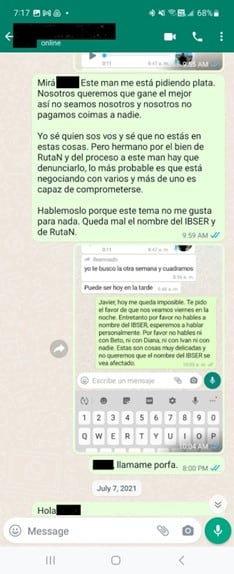 Entre las pruebas, hay por lo menos 15 comunicaciones entre pantallazos de WhatsApp y correos electrónicos en los que IBSER informa a directivos y funcionarios de RUTA N sobre su preocupación con respecto a que el señor Fernández esté presionando para que se pague el 10% del valor de esos contratos que se estaban licitando en junio de 2021.