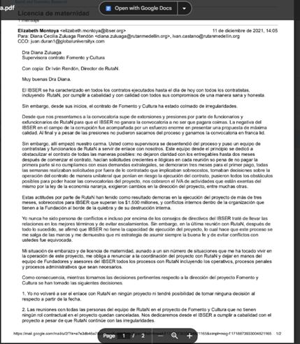 Otra de esas comunicaciones fue un correo que le enviaron desde la Fundación IBSER, el 11 de diciembre de 2021, en el que se hace un recuento del periplo que hasta ese momento había pasado para poder cumplir con el contrato luego de negarse a las extorsiones.