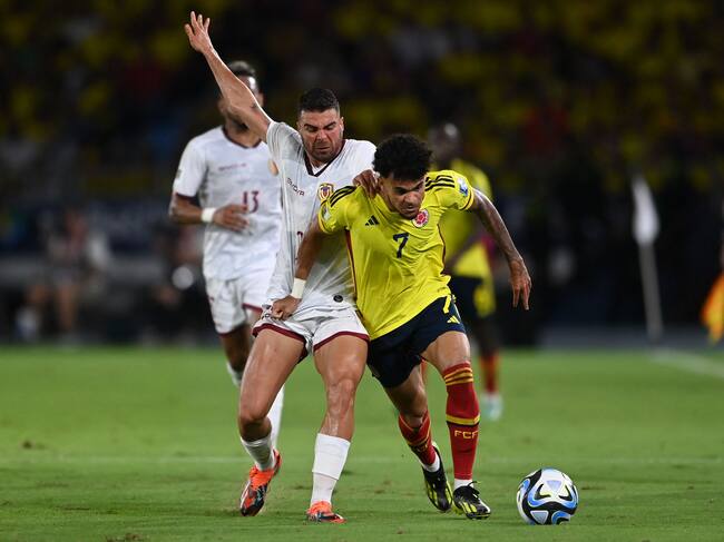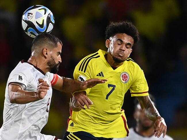 El mediocampista venezolano Tomás Rincón (i) y el delantero colombiano Luis Díaz luchan por el balón durante el partido de fútbol de las eliminatorias sudamericanas de la Copa Mundial de la FIFA 2026 / JUAN BARRETO