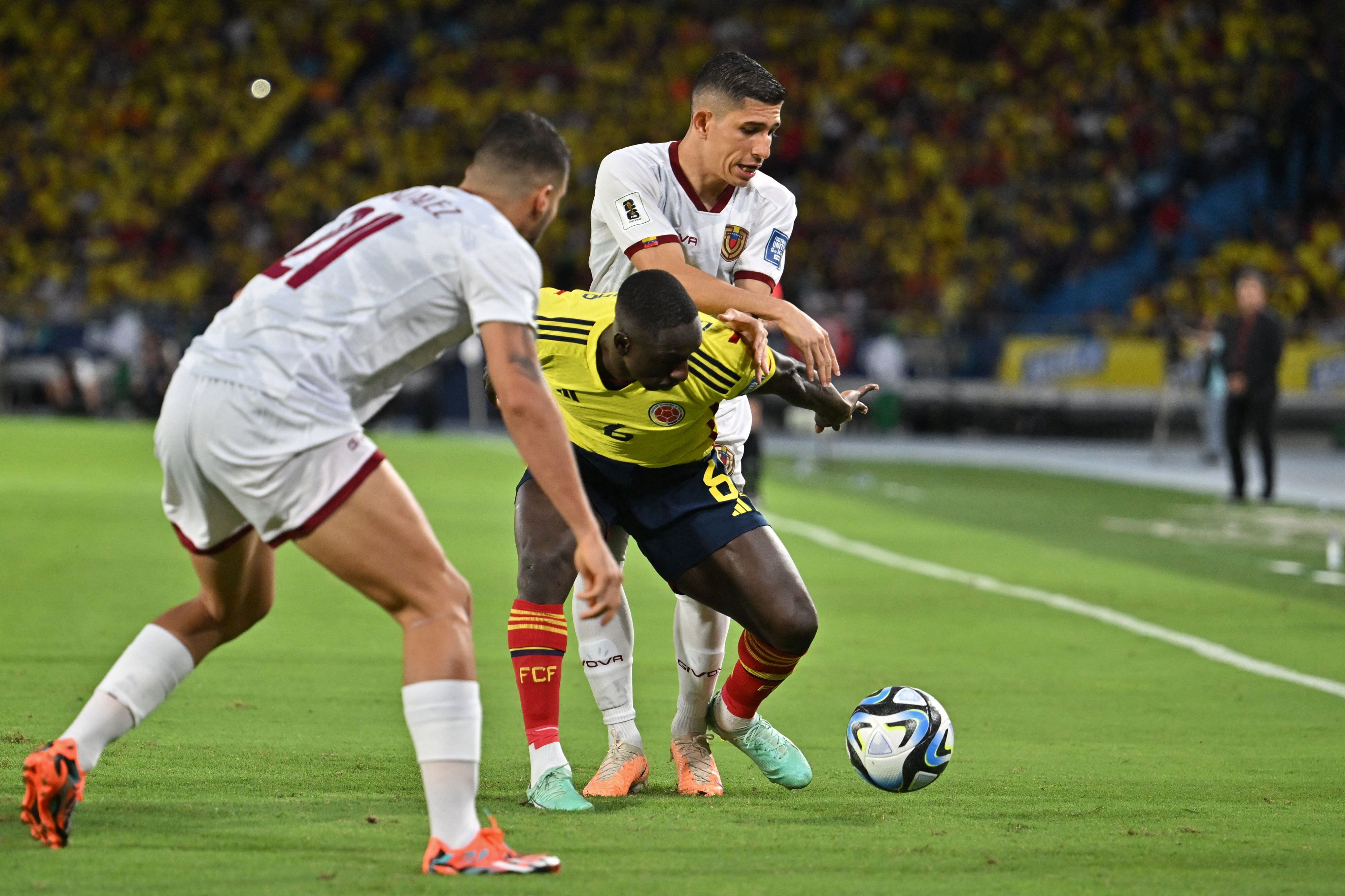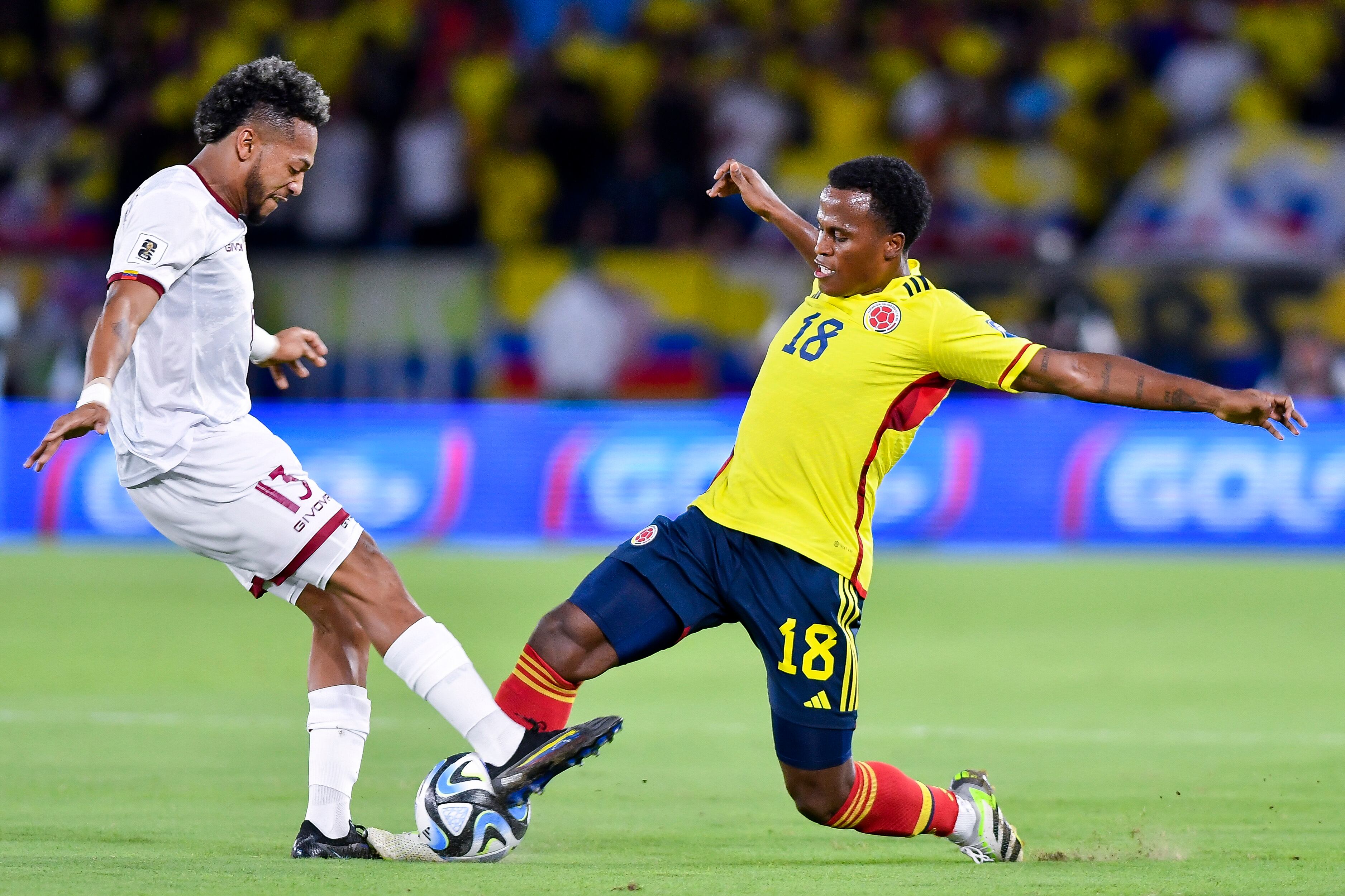 - Jhon Arias de Colombia lucha por la posesión con José Martínez de Venezuela durante un partido de clasificación para la Copa Mundial de la FIFA 2026.