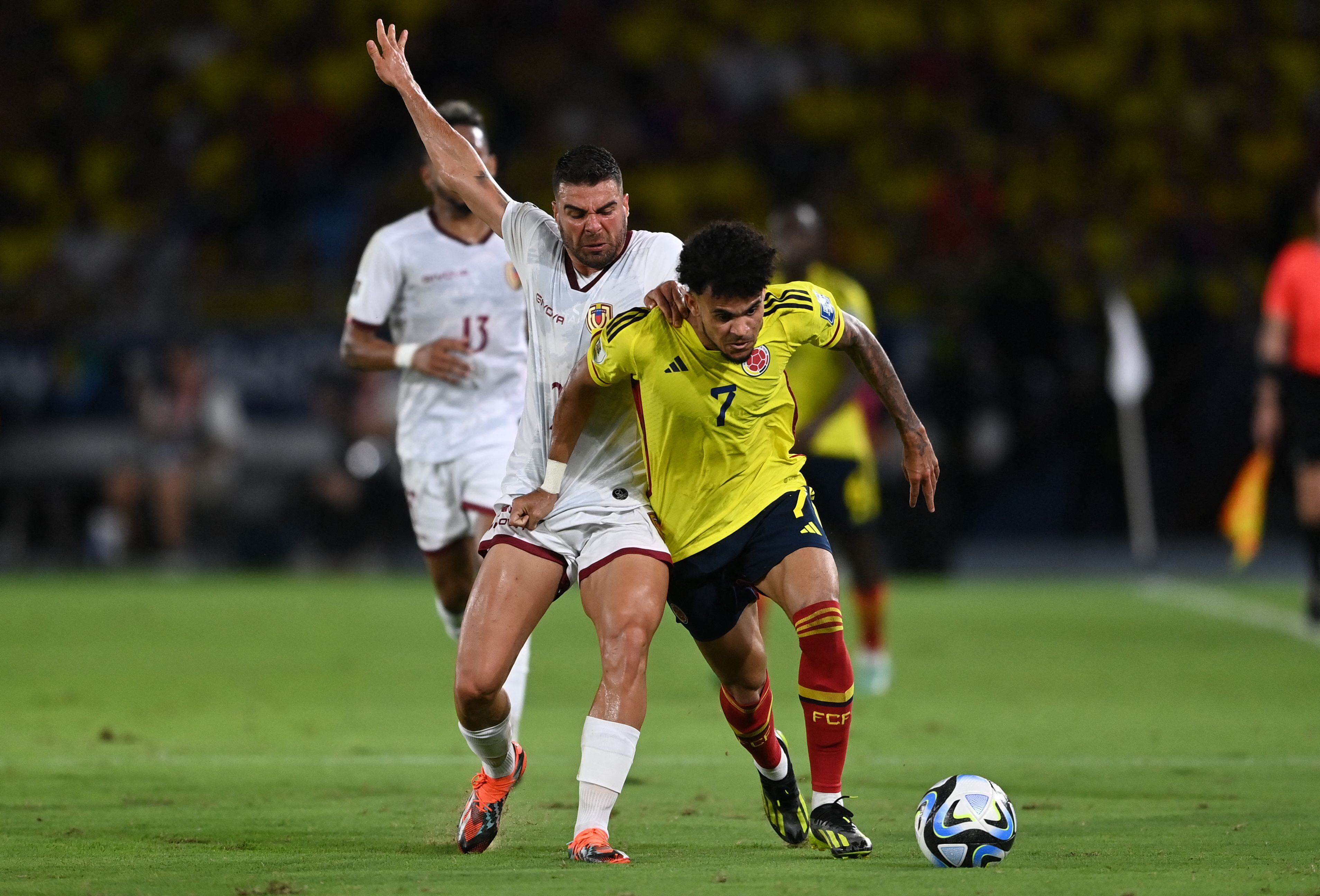 El mediocampista venezolano Tomás Rincón (i) y el delantero colombiano Luis Díaz luchan por el balón durante el partido de fútbol de las eliminatorias sudamericanas de la Copa Mundial de la FIFA 2026 / JUAN BARRETO