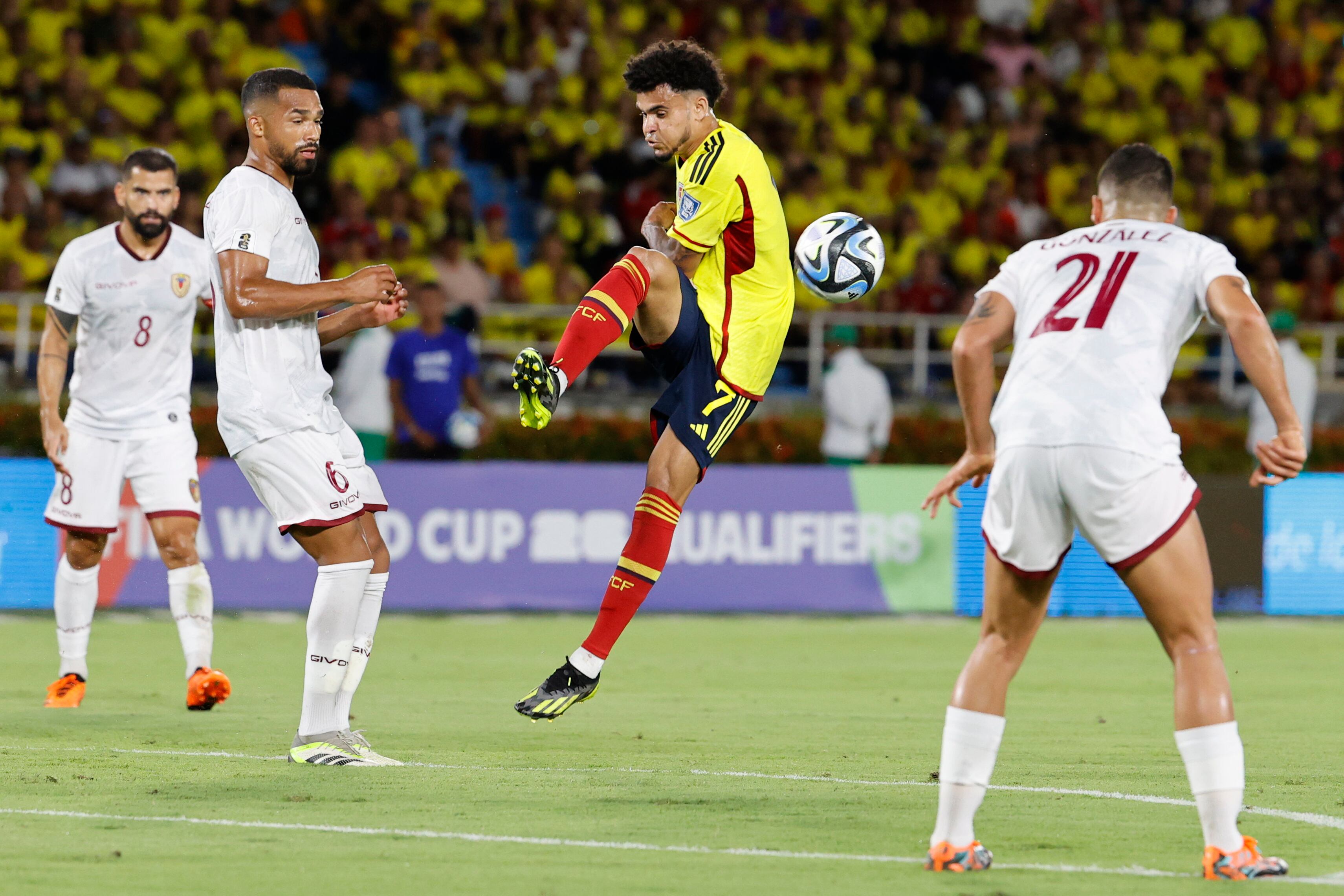 AMDEP8964. BARRANQUILLA (COLOMBIA), 07/09/2023.- Luis Díaz (c) de Colombia disputa un balón con Yangel Herrera (i) de Venezuela hoy, en un partido de las Eliminatorias Sudamericanas para la Copa Mundial de Fútbol 2026 entre Colombia y Venezuela en el estadio Metropolitano en Barranquilla (Colombia). EFE/ Mauricio Dueñas Castañeda / Mauricio Dueñas Castañeda