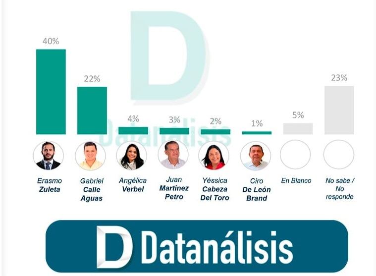 En la misma medición, Angélica Verbel logra un 4%, Juan Martínez Petro alcanza un 3%, Yessica Cabeza, quien la semana anterior anunció su retiro de la contienda electoral y su adhesión a Erasmo Zuleta, logra un 2%, y Ciro de León obtuvo un 1%. El voto en blanco registra el 5% y No sabe / No responde registró el 23%.