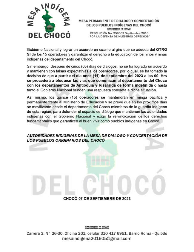 Según los representantes de las comunidades indígenas Embera Dobida, Embera Katio, Embera Chami, Wounaan y Guna Dule, que habitan en esta región selvática, han agotado el diálogo con representantes del gobierno nacional y explican que han encontrado negativas y dilaciones para que le adicionen OTRO SI a 15 contratos que le prestan los servicios educativos a los indígenas. Recuerdan en un comunicado que el pasado 12 de agosto se reunieron con autoridades de la gobernación del Chocó para buscar soluciones “en la cual expresaron la NO garantía presupuestal para los OTRO SI”, ante este panorama un grupo de 40 personas viajó a la ciudad de Bogotá, exactamente a la sede del Ministerio de Educación el pasado 02 de septiembre “Sin embargo, después de cinco (05) días de diálogos, no se ha logrado un acuerdo y mantienen con falsas expectativas a los operadores, por lo cual, se ha tomado la decisión de que a partir del día once (11) de septiembre del 2023 a las 00. Horas se procederá a bloquear las vías que comunican al departamento del Chocó con los departamentos de Antioquia y Risaralda de forma indefinida o hasta tanto el Gobierno Nacional brinde una respuesta concreta a dicha situación”.