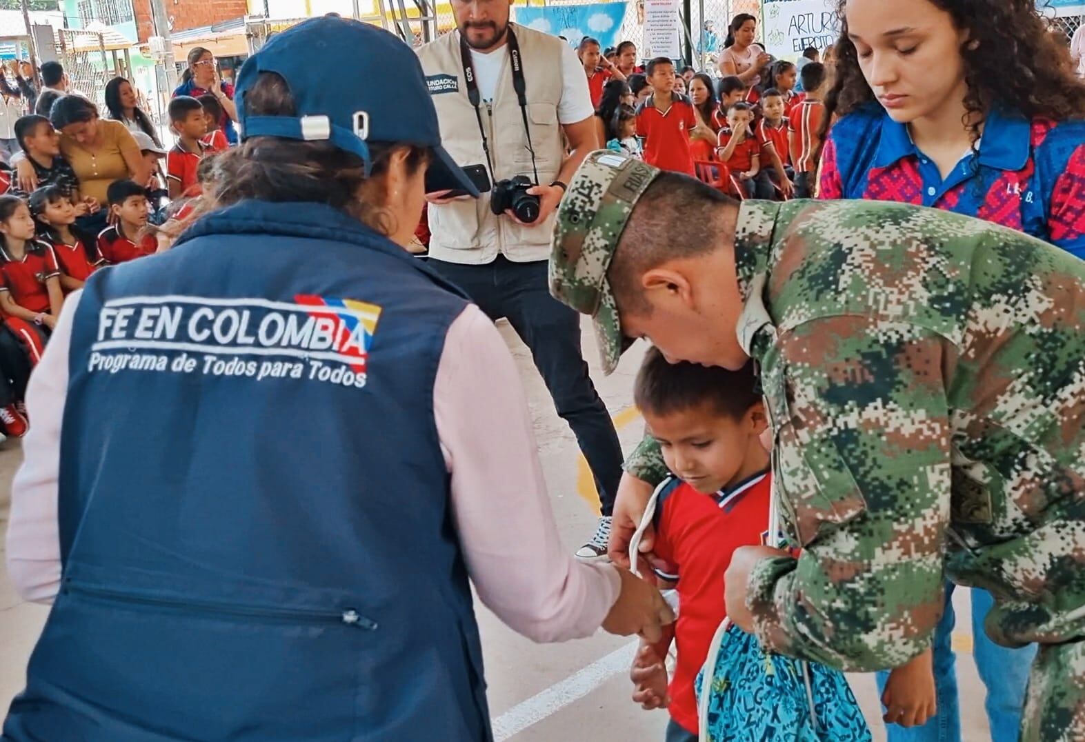 “Cada uno de mis estudiantes hace un esfuerzo de desplazamiento ya que tienen que avanzar por veredas, travesías y quebradas; y aquí están presentes con la ilusión y la expectativa de recibir los kits escolares que trajeron el Ejército Nacional y la Fundación Arturo Calle”, aseguró Rincón.