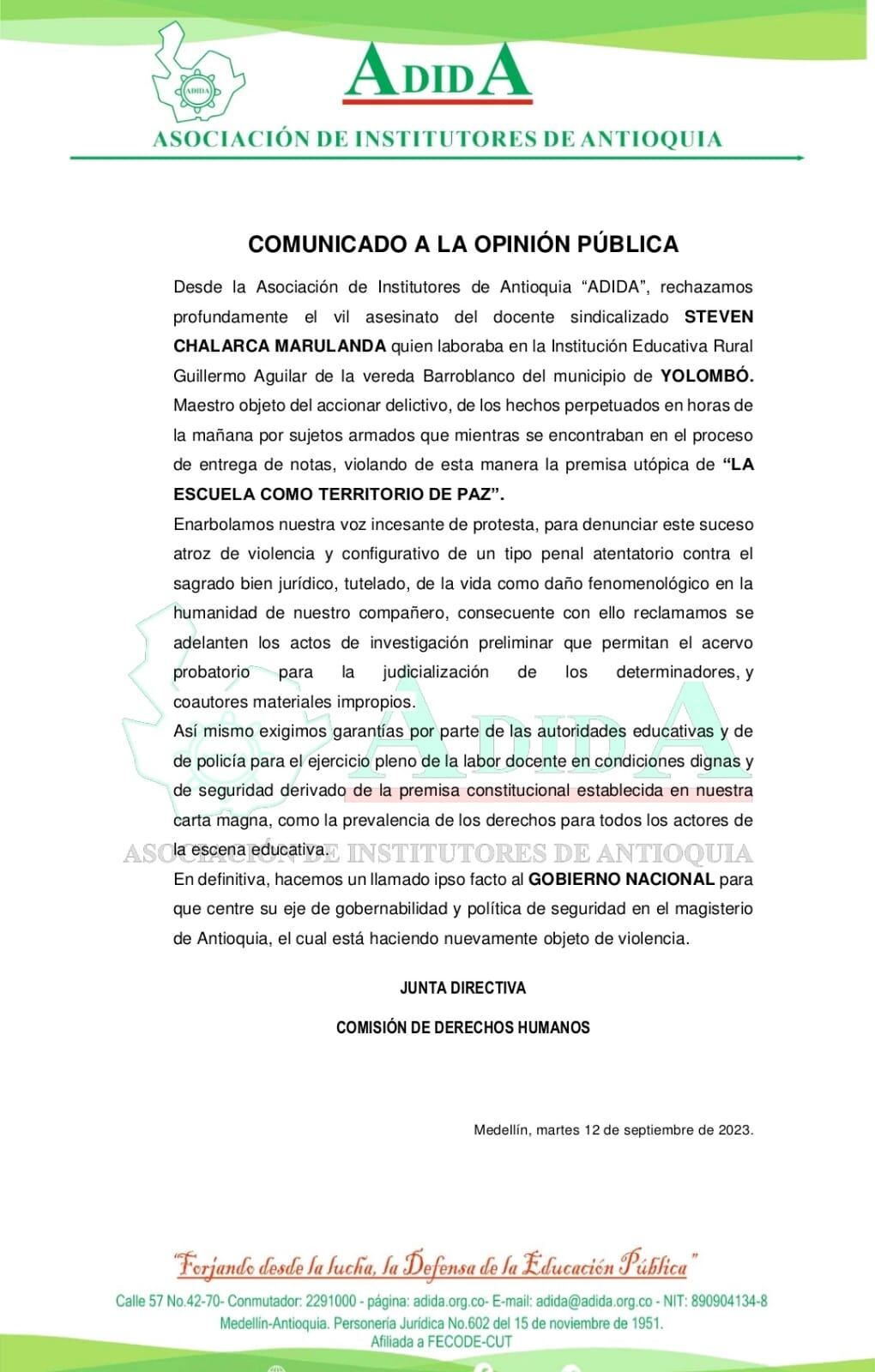 Mientras que Desde ADIDA rechazaron este crimen y mediante un comunicado de prensa indicaron “reclamamos se adelanten los actos de investigación preliminar que permitan el acervo probatorio para la judicialización de los determinadores, y coautores materiales impropios. Así mismo exigimos garantías por parte de las autoridades educativas y de policía para el ejercicio pleno de la labor docente en condiciones dignas y de seguridad derivado de la premisa constitucional establecida en nuestra carta magna, como la prevalencia de los derechos para todos los actores de la escena educativa”.