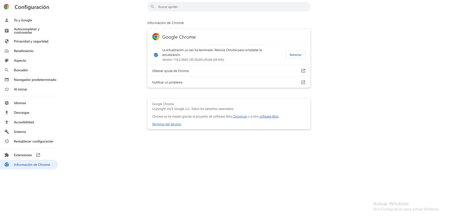- Ejemplo: La actualización ya casi ha terminado. Reinicia Chrome para completar la actualización. Versión 116.0.5845.180 (Build oficial) (64 bits).