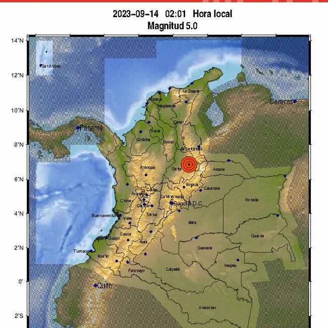 Un fuerte temblor se presentó en horas de la mañana de este jueves 14 de septiembre en Colombia. De acuerdo al Servicio Geológico Colombiano, a las 02:01 hora local se sintió un sismo de magnitud 5.5, y profundidad de 154 km, en Los Santos - Santander, Colombia.