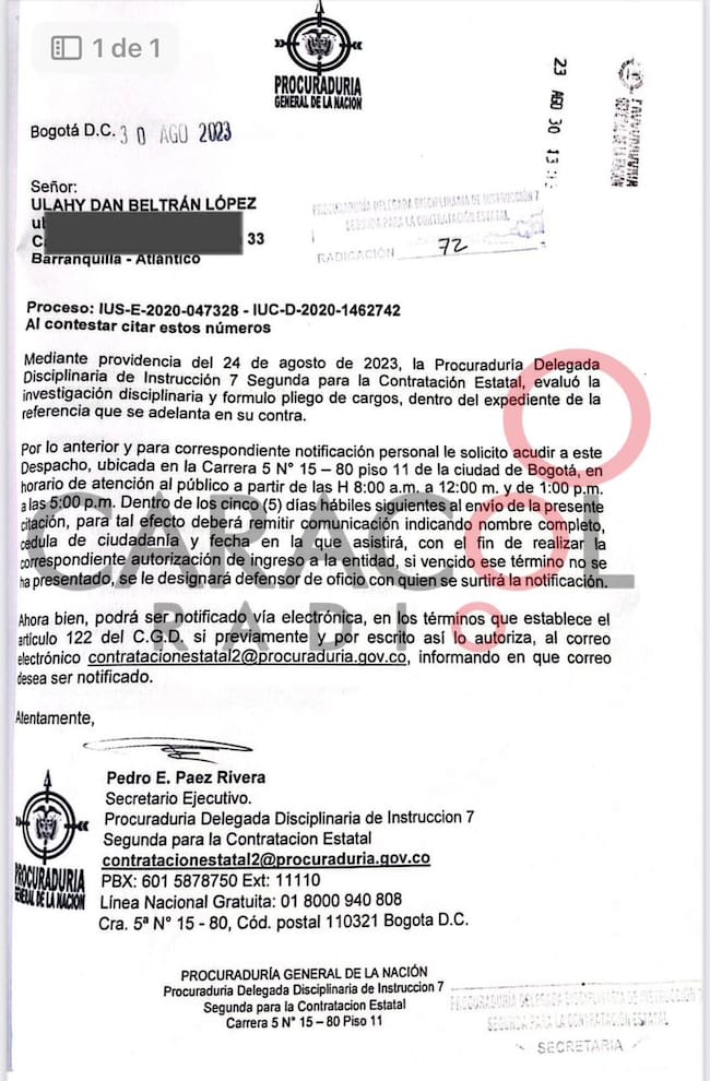 Este confidencial conoció el documento de la Procuraduría con fecha del 30 de agosto, en el que se observa que la notificación fue enviada a una dirección física en Barranquilla y remitida por medios digitales al correo electrónico del superintendente Beltrán. Así mismo, en otra carta conocida por esta sección, se notifica a Ángela Yamile Parra, abogada defensora del Superintendente de Salud.