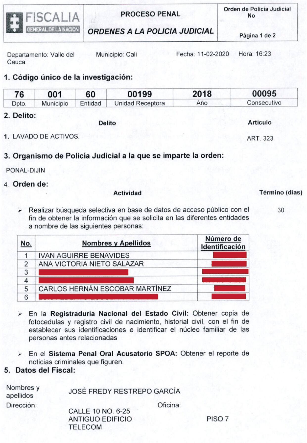 La orden de rastrear los bienes del abogado defensor y su familia, se dio en noviembre de 2019 por el entonces fiscal tercero delegado ante Tribunal en Cali, José Fredy Restrepo, quien para esa época era el fiscal que investigaba al caso de los presuntos ‘narcofiscales’