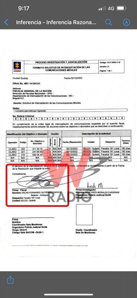 Basados en esa fuente, los hombres de la Dijin le pidieron al fiscal en 2022 la interceptación del teléfono de alias ‘La Cocinera’, como consta en un formato de la Fiscalía.