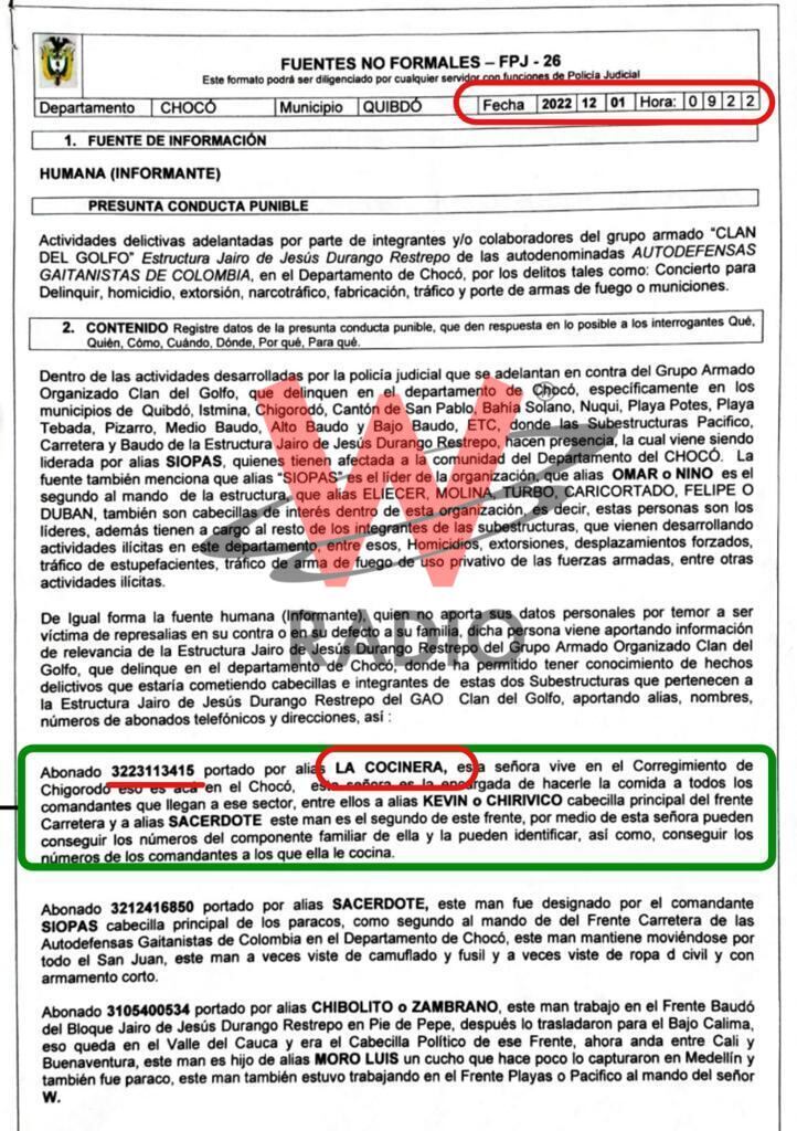 La información está registrada en un reporte de Policía Judicial producido un día antes, el 1 de diciembre de 2022 a las 9:22 de la mañana. En ese informe se menciona que una fuente humana entregó información y teléfonos de alias ‘La Cocinera’, alias ‘Sacerdote’, y alias ‘Chibolito’, integrantes de la estructura del jefe del Clan del Golfo, Wilmer Antonio Giraldo, alias ‘Siopas’.