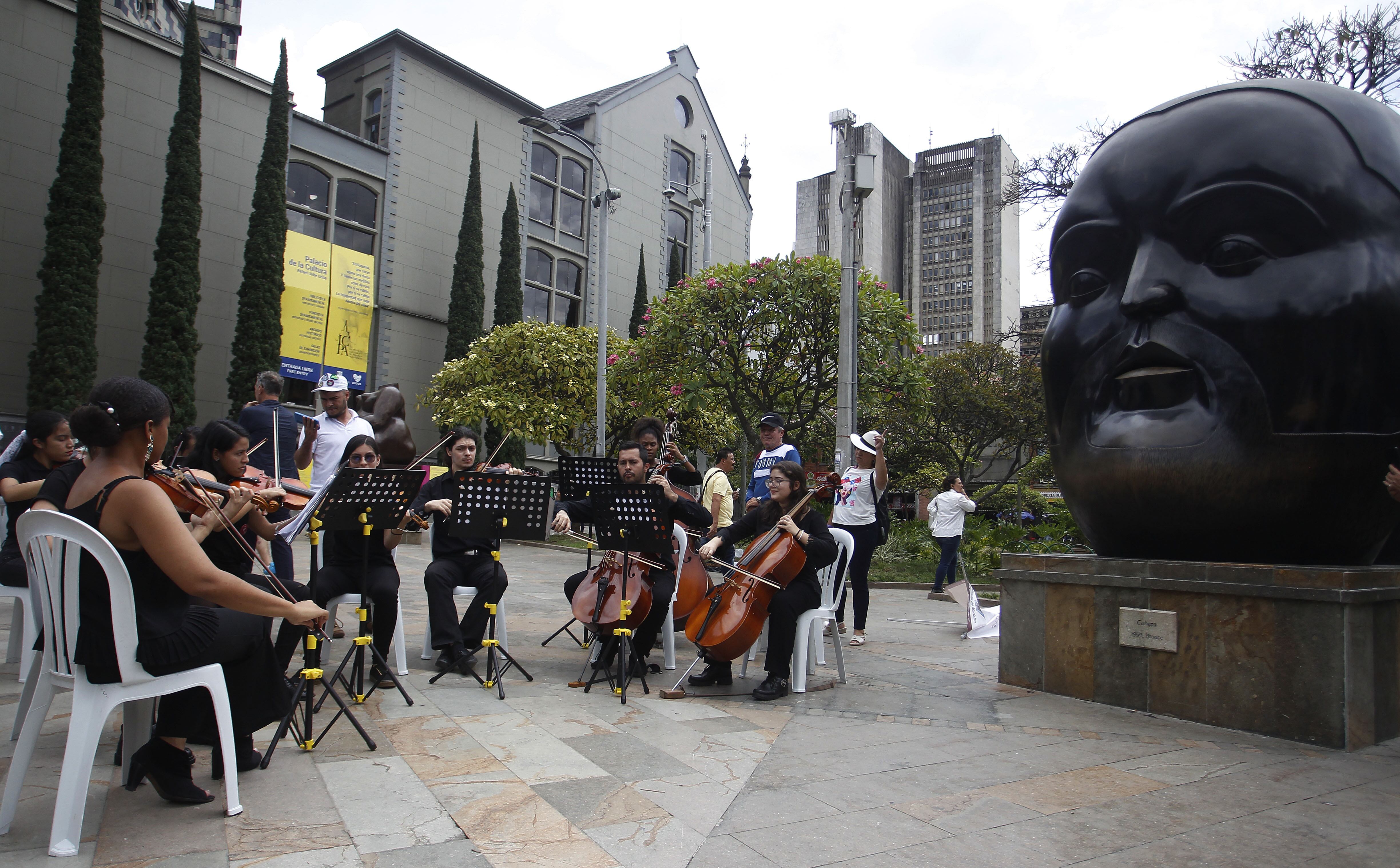 La escuela de música del barrio Boston toca durante un homenaje al maestro Fernando Botero, hoy, en la Plaza Botero, en Medellín (Colombia). Foto: EFE/Luis Eduardo Noriega A. / Luis Eduardo Noriega A.