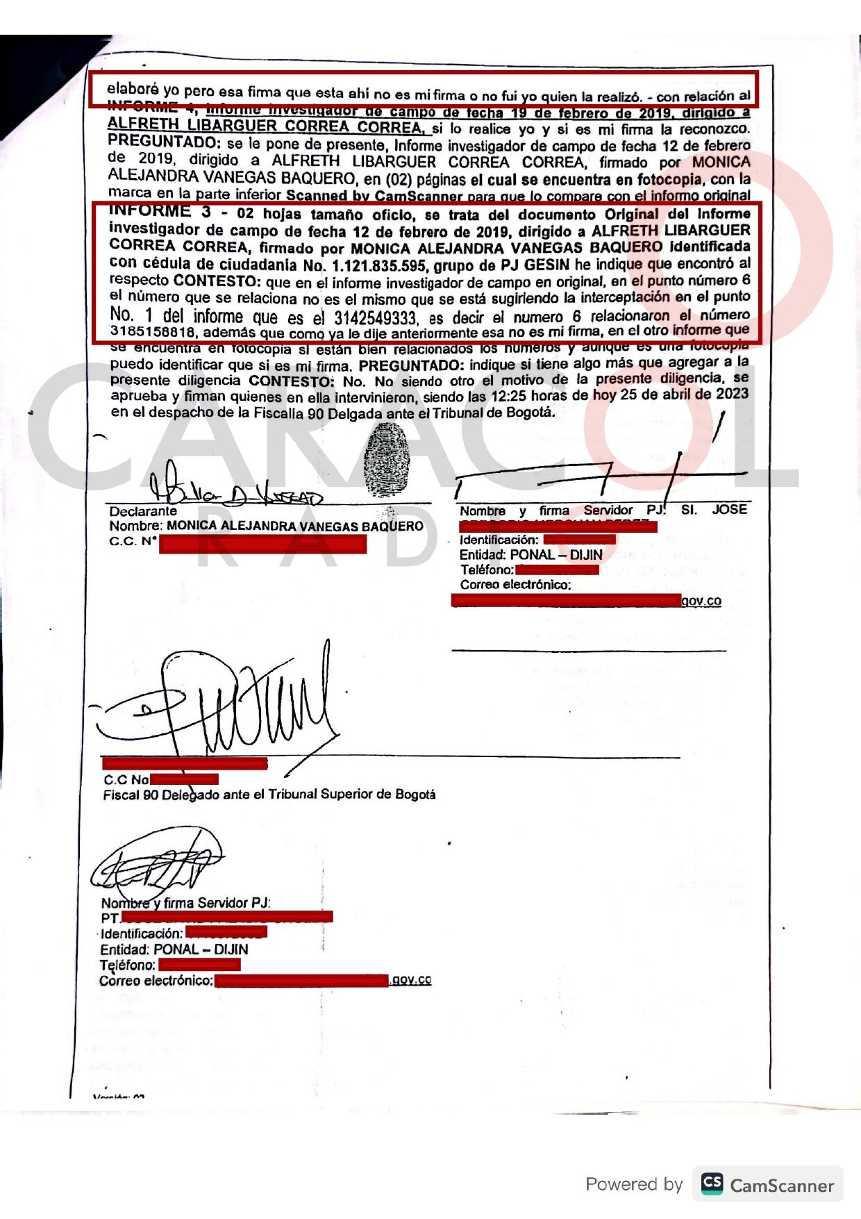 la declaración jurada que rindió ante un fiscal anticorrupción, la subteniente de la Policía Nacional Mónica Alejandra Vanegas, analista de comunicaciones criminales y en la que aseguró que a ella le falsificaron la firma