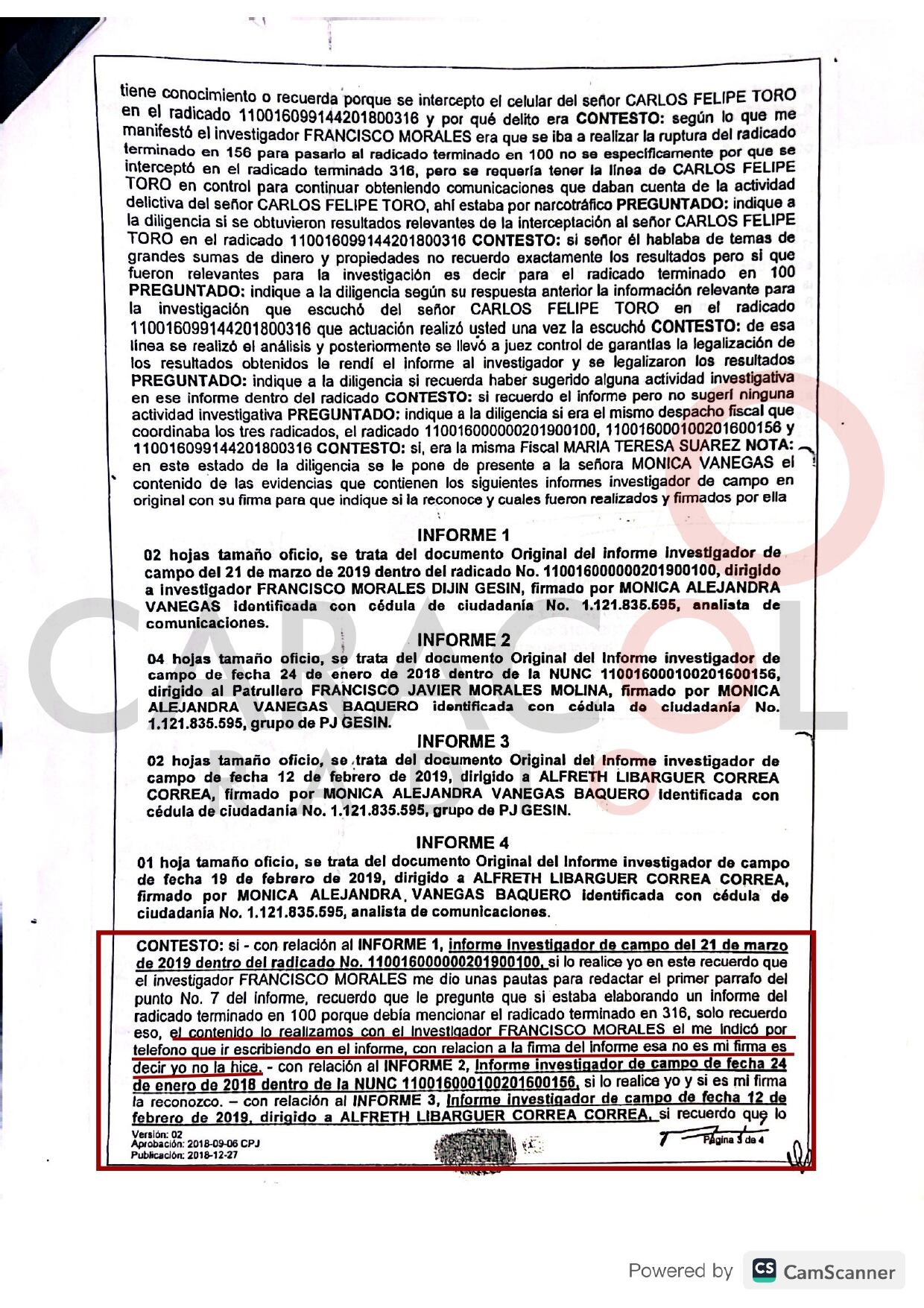 Caracol Radio conoció la declaración jurada que rindió ante un fiscal anticorrupción, la subteniente de la Policía Nacional Mónica Alejandra Vanegas, analista de comunicaciones criminales y en la que aseguró que a ella le falsificaron la firma en los informe de policía judicial con los que se hicieron seguimientos al exnarco Carlos Felipe Toro, alias ‘Pipe Montoya’, su esposa y un veterinario.