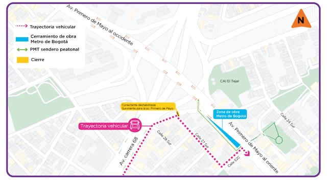 “Este Plan de Manejo de Tránsito (PMT) se habilitó para permitir la construcción de un carril adicional destinado a los vehículos que circulan por la calzada sur sentido occidente – oriente para tomar la av. Primero de Mayo. Los conductores que se movilicen por la av. 68 en sentido sur-norte que quieran tomar la avenida Primero de Mayo hacia el oriente, deberán hacerlo por el desvío habilitado en la calle 27 sur hasta llegar a la calle 52C.” explicó la entidad.