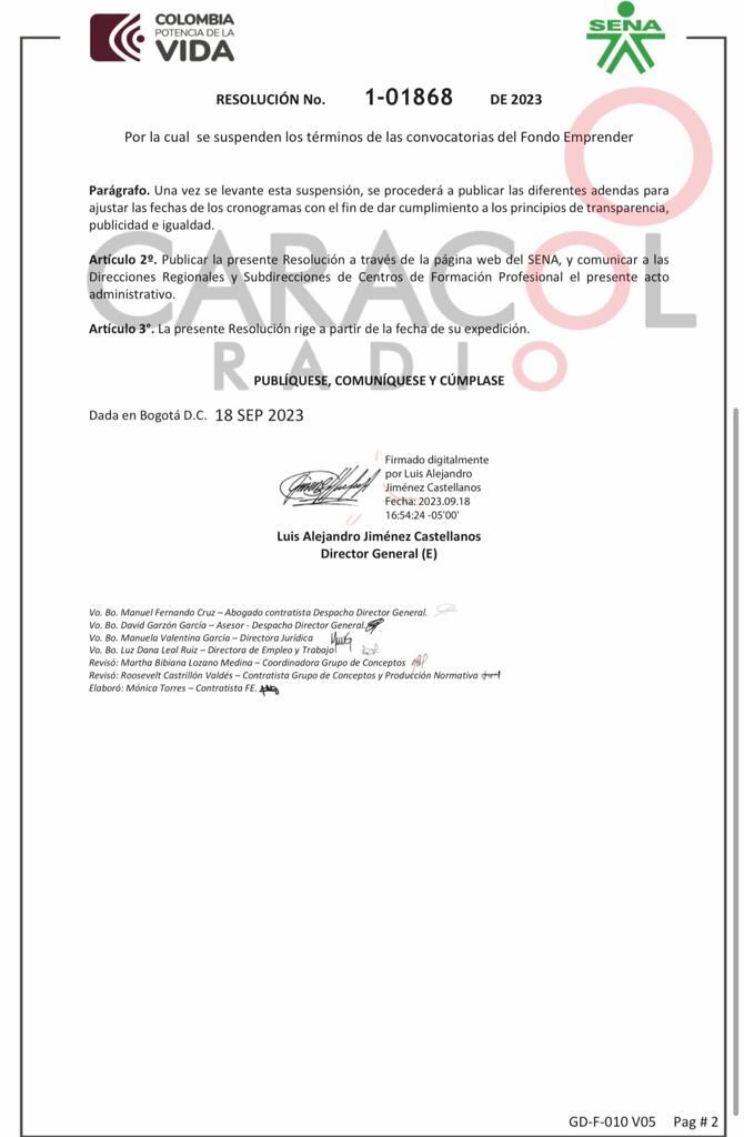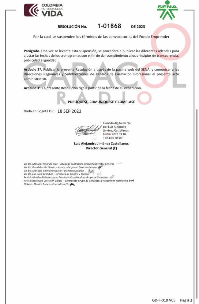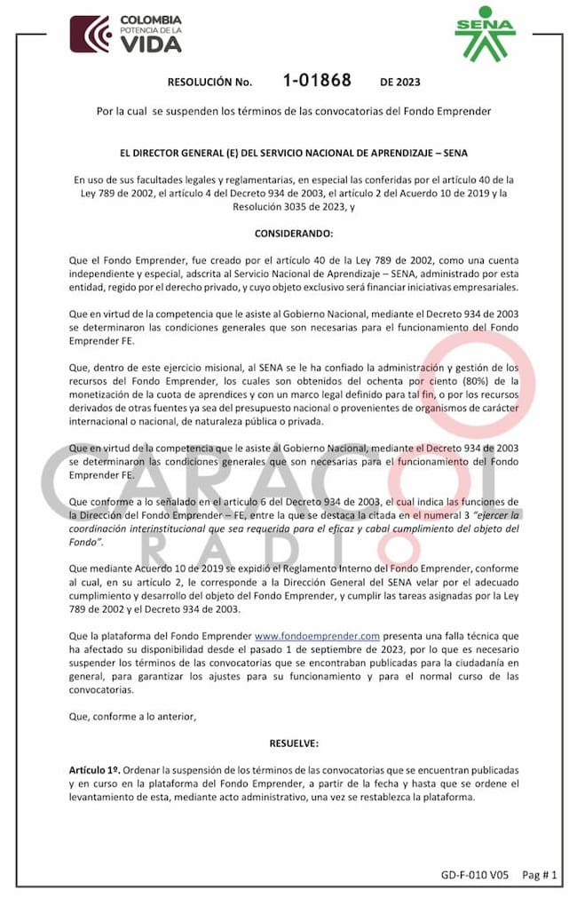 Este confidencial conoció la resolución 1-01808 de este 2023 del SENA, que suspendió los términos de las convocatorias en curso del Fondo Emprender, que incluyen más de 20.000 millones de pesos para emprendedores rurales, y otros $10.000 millones de pesos que prometió el presidente Gustavo Petro para tenderos y vendedores populares.