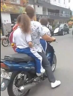 El caso más reciente fue grabado por un conductor en el sector de Las Delicias al sur de Bucaramanga en donde se ve cómo una mujer lleva a dos menores, uno adelante y otra de parrillera, todos tres sin cascos.
