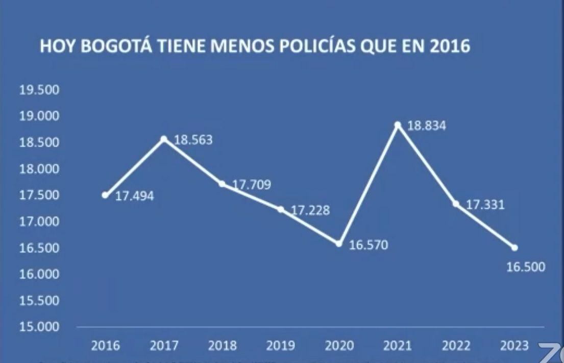 ”Bogotá tiene hoy, en el año 2023, menos policías de los que teníamos en el año 2016, en vez de echar para adelante estamos echando es hacia atrás”.