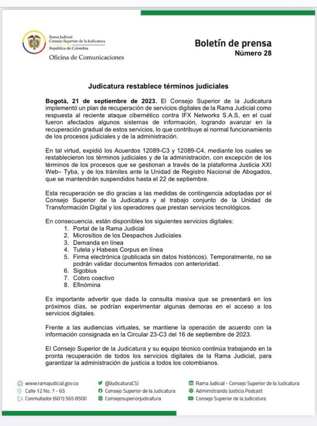 Tras el ataque cibernético IFX Networks S.A.S, el Consejo Superior de la Judicatura restableció los términos judiciales debido a que se ha logrado avanzar en la recuperación gradual de algunos servicios en la Rama Judicial.