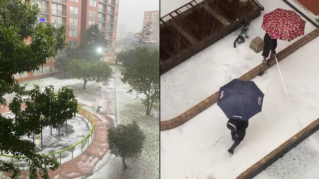 Varios usuarios en redes sociales han empezado a compartir videos e imágenes de la granizada que se presenta en varias localidades. En las que se puede ver la capa blanca de granizo que se empieza a acumular en el césped.