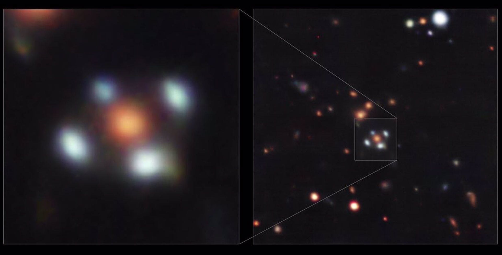Al cumplir esta función, permite que se genere una multiplicación por cuatro de la imagen de la galaxia de color azul, por el efecto “lente” de la galaxia sobrepuesta y la luz emitida de esa galaxia distante.