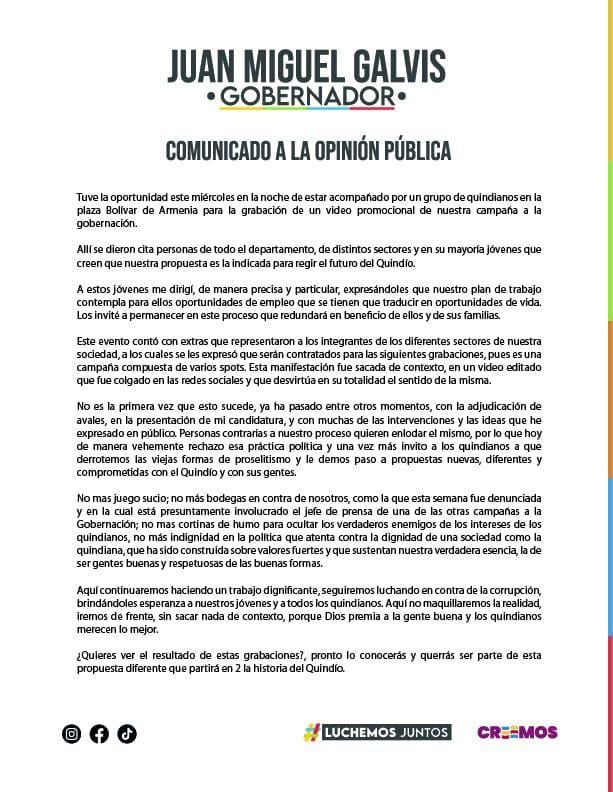 Comunicado Juan Miguel Galvis- Cortesía Campaña