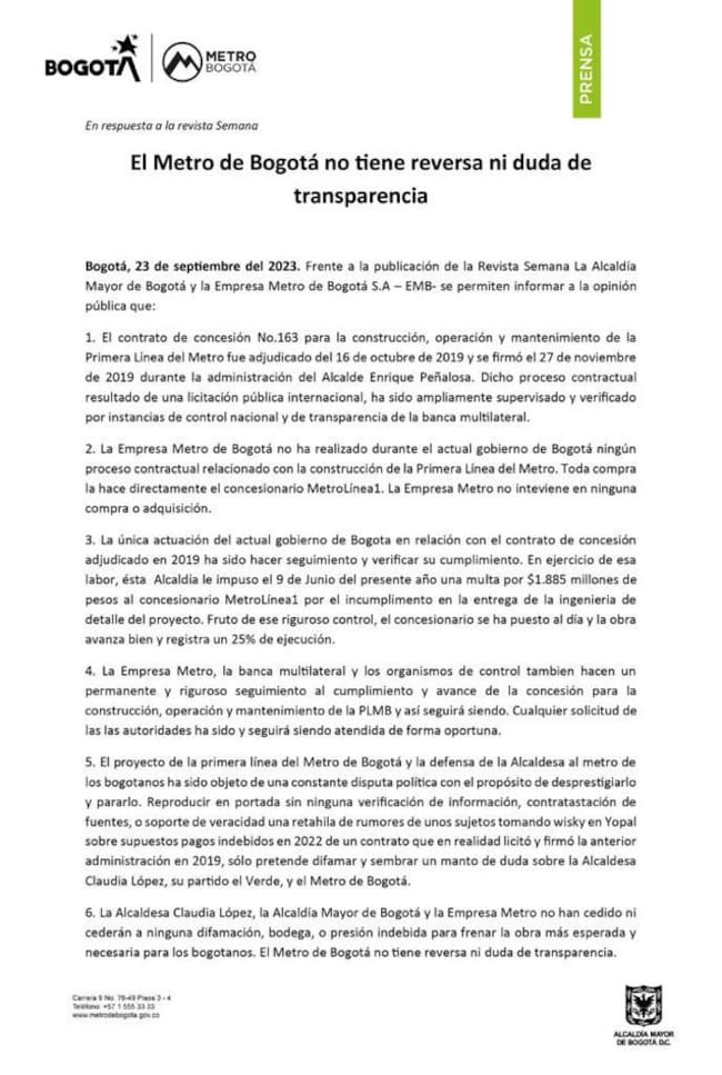“Una retahíla de rumores de unos sujetos tomando whisky en Yopal sobre supuestos pagos indebidos en 2022 de un contrato que en realidad licitó y firmó la anterior administración en 2019 para la primera línea del metro sólo pretende difamar y sembrar un manto de duda sobre mi persona, mi Alcaldía, mi partido el Verde, y el Metro de Bogotá”, indica el comunicado.
