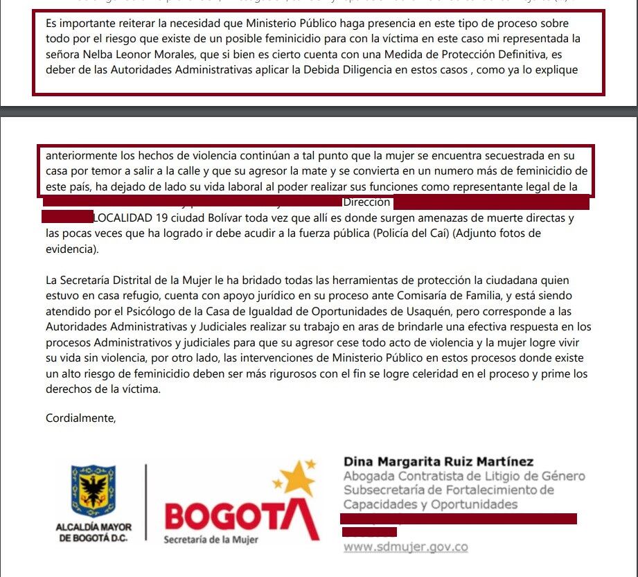 La Secretaría de la Mujer, en un documento reciente le pidió a la Personería de Bogotá y a otras autoridades que se haga una intervención especial a este caso, porque el agresor ha incumplido las órdenes de restricción que le prohíben acercarse a la víctima, porque “los hechos de violencia continúan a tal punto que la mujer se encuentra secuestrada en su casa por temor a salir a la calle”.