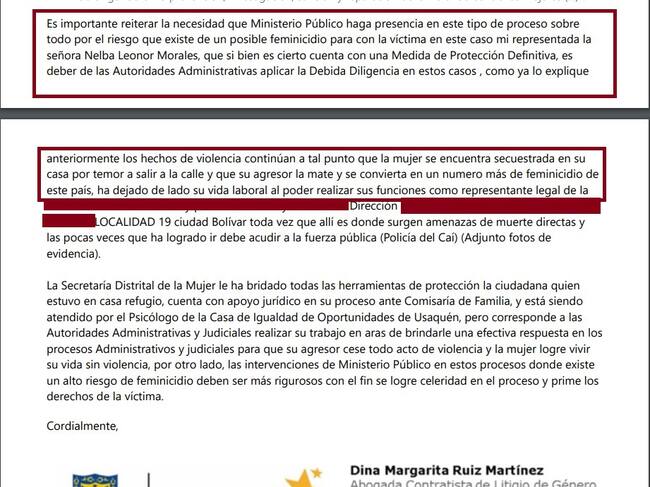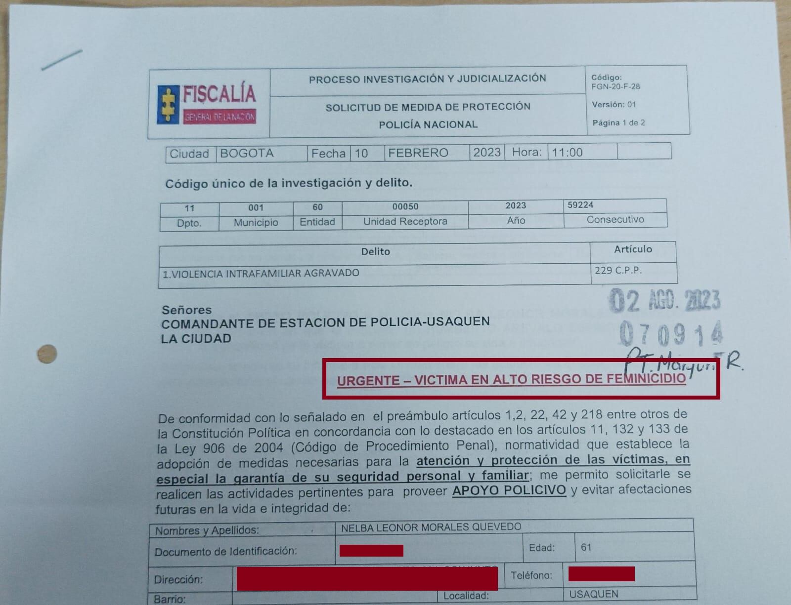 La Fiscalía ordenó apoyo policivo y vigilancia permanente, porque es una víctima en alto riesgo de feminicidio. También lo acredita un dictamen de medicina Legal ella es una víctima en riesgo extremo.