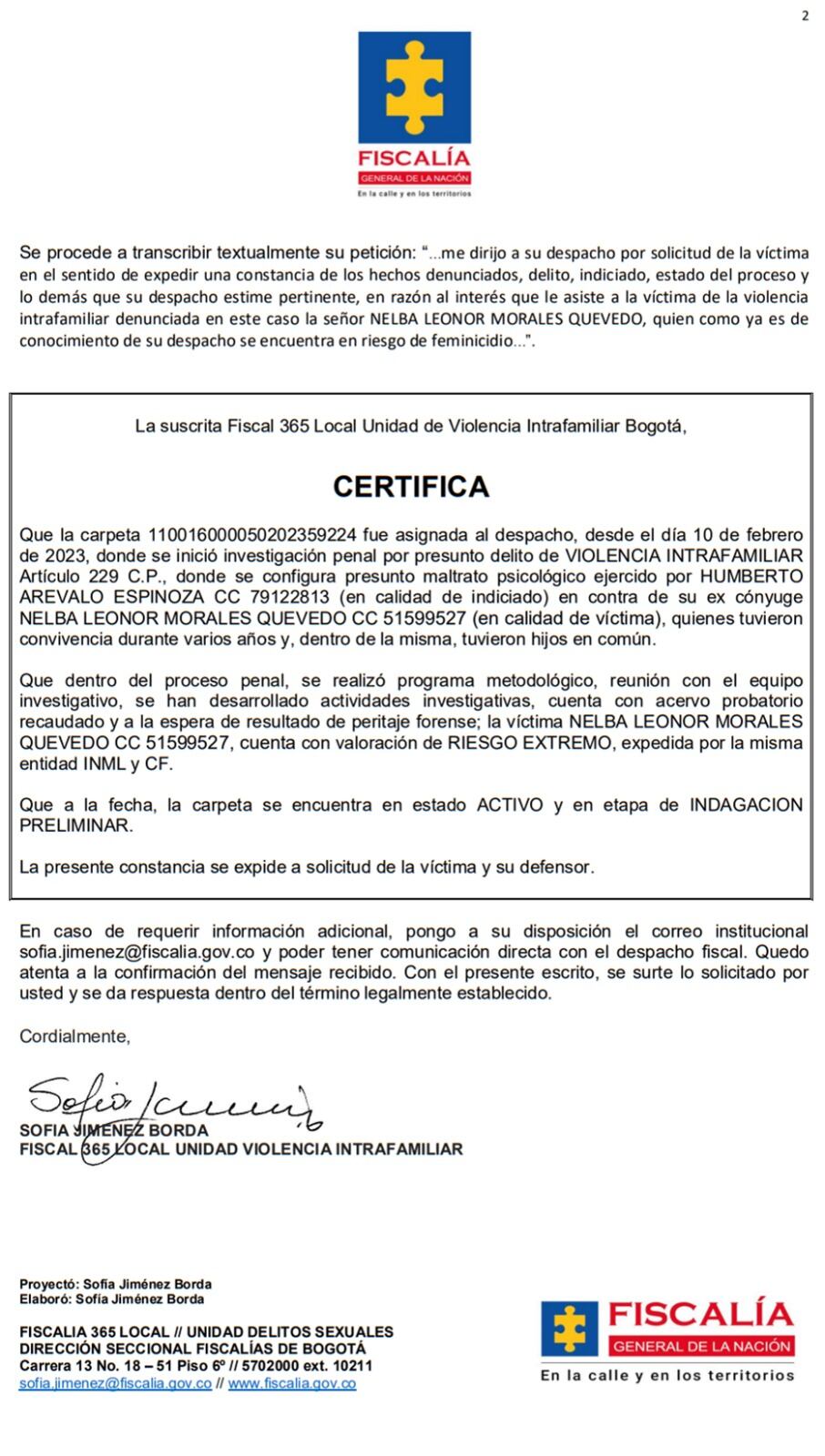 A pesar de todas las advertencias de las autoridades para evitar un caso más de feminicidio, la Fiscalía le abrió un proceso a la señora Nelba por supuesta administración desleal y falsedad en documento privado.