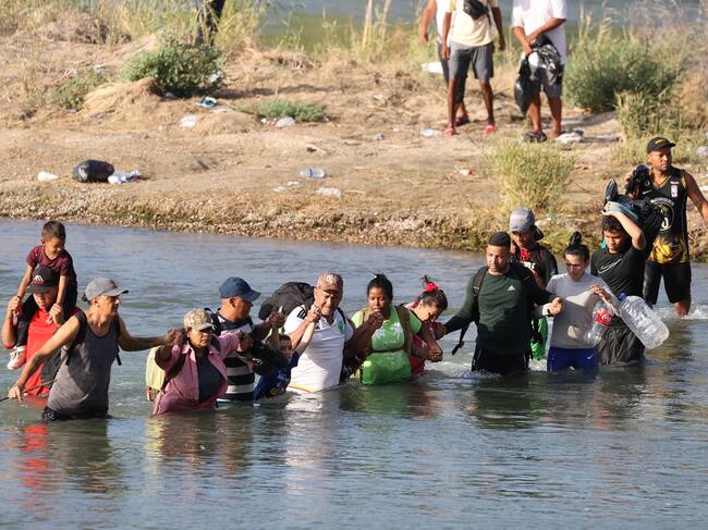 Eagle Pass (United States), 22/09/2023.- Migrants cross the Rio Grande in Eagle Pass Texas, USA, 22 September 2023. The Mayor of Eagle Pass Rolando Salinas Jr. estimated that 2,000 migrants crossed the border on 21 September, after about 3,000 migrants crossed into Eagle Pass on 20 September, according to the U.S. Representative Tony Gonzales. Mayor Salinas Jr. on 19 September declared a 'local state of disaster' in an emergency declaration issued after over 1,000 migrants crossed the border. EFE/EPA/ADAM DAVIS / ADAM DAVIS (EFE)