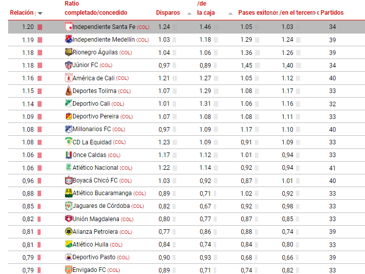 Santa Fe destaca en el primer lugar con un ratio (relación cuantificada) de 1.20, tras un promedio de 1.24 remates y 1.46 disparos dentro del área. En los 34 partidos contabilizados, también obtuvo un promedio de 1.05 pases exitosos y 1.3 pases en el último tercio del campo. Sin embargo, está lejos de los primeros lugares de la clasificación.