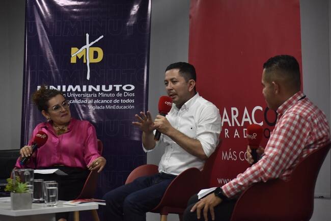José Barreto en el conversatorio con la vicerrectora Tolima y Magdalena Medio de Uniminuto y el periodista Julio Montiel