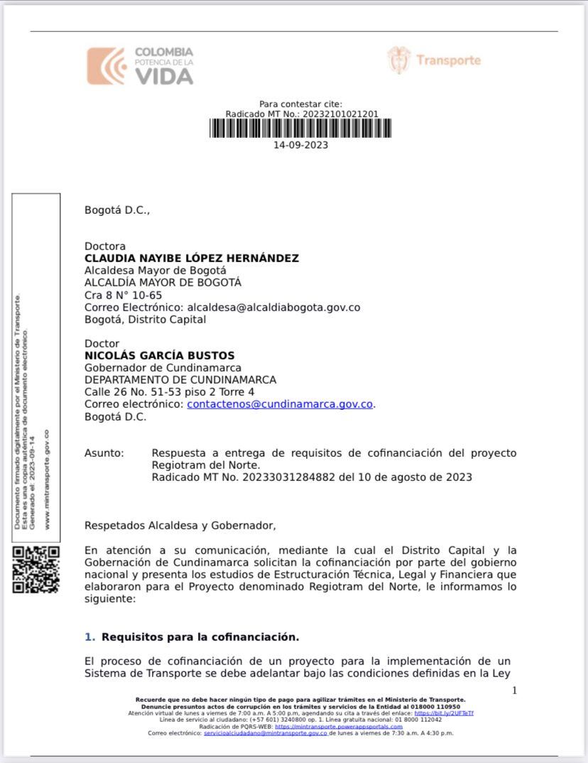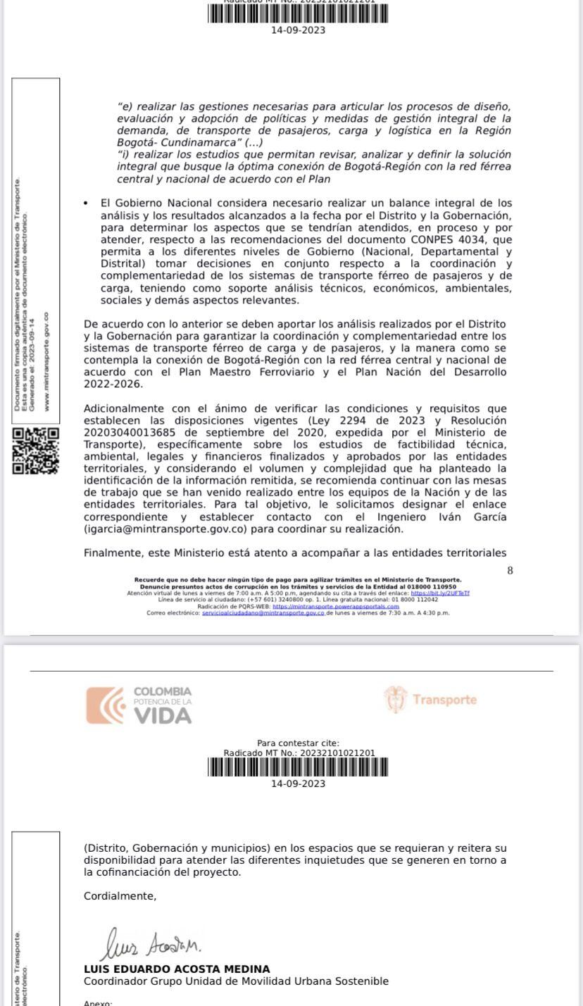 El Gobierno Nacional, mediante una carta, le respondió a la alcaldía de Bogotá y a la Gobernación de Cundinamarca sobre las condiciones para la cofinanciación del proyecto Regiotram del Norte. En la comunicación les ratificó que el proyecto debe incluir transporte de carga y no sólo de pasajeros.