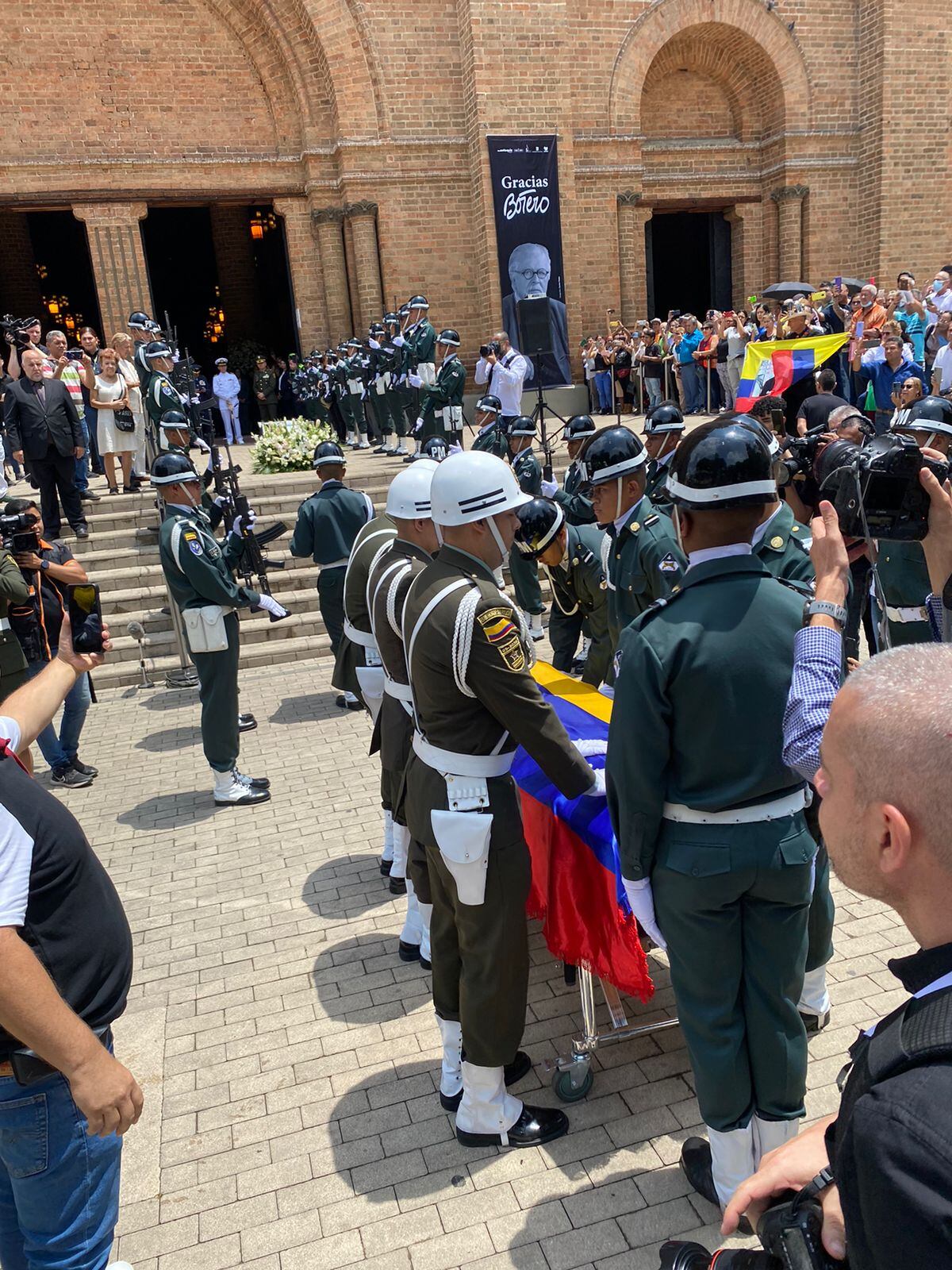 El cuerpo del maestro Botero llegó en el carro fúnebre hasta la Catedral Basílica Metropolitana, Centro de Medellín, acompañado de sus tres hijos.