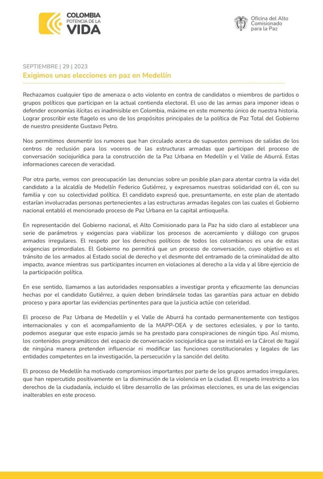 La Oficina del Comisionado de Paz aseguró en un comunicado que el gobierno ve con preocupación las denuncias sobre un posible atentado contra el candidato Federico Gutiérrez, caso que se dio a conocer en 6am hoy por hoy de Caracol Radio.