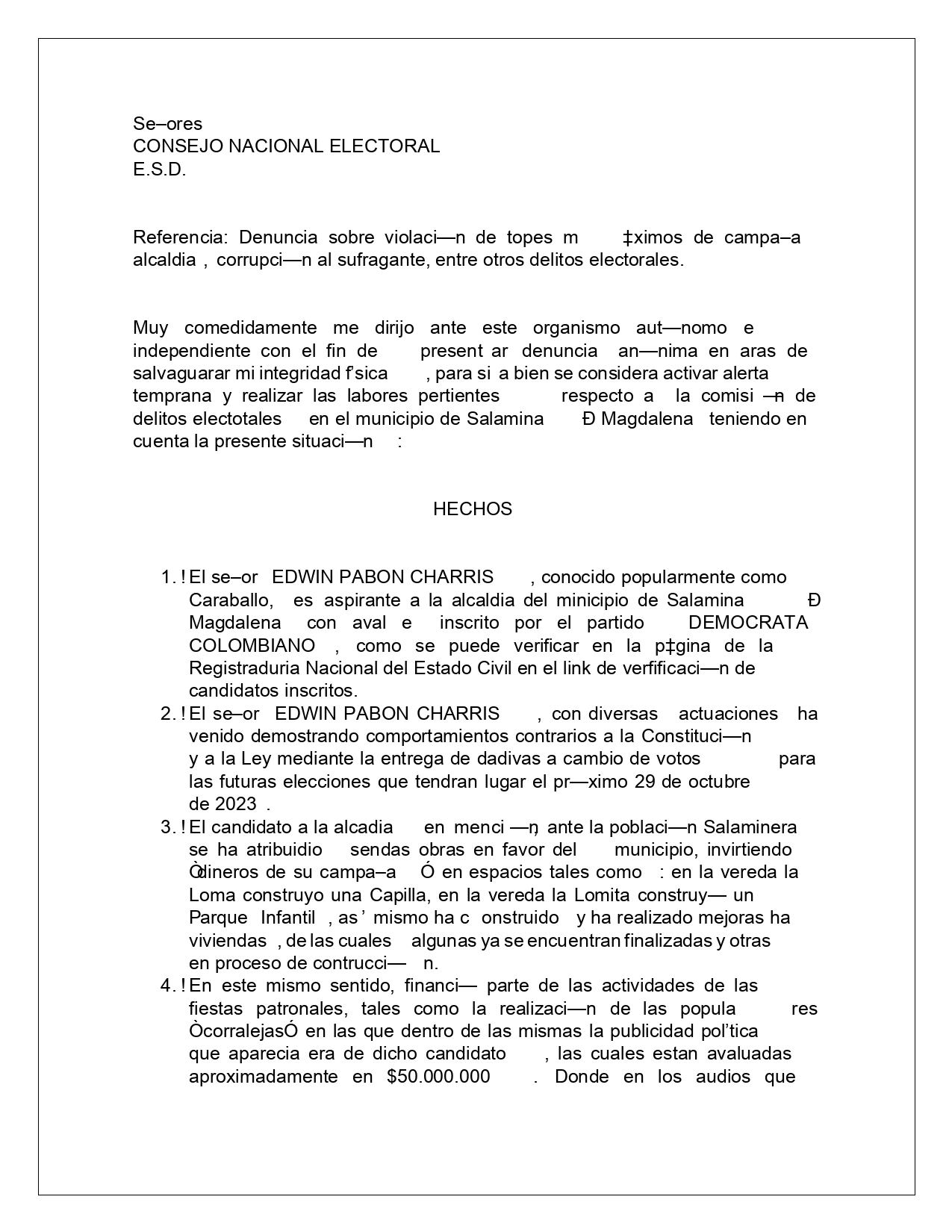 “El candidato a la Alcadía en mención, ante la población Salaminera se ha atribuido sendas obras en favor del municipio, invirtiendo “dineros de su campaña” en espacios tales como: en la vereda la Loma construyó una Capilla, en la vereda La Lomita construyó un Parque Infantil. Así mismo ha construido y ha realizado mejoras a viviendas, de las cuales algunas ya se encuentran finalizadas y otras en proceso de contrucción”, indicó un aparte del documento enviado a la Fiscalía y al CNE.