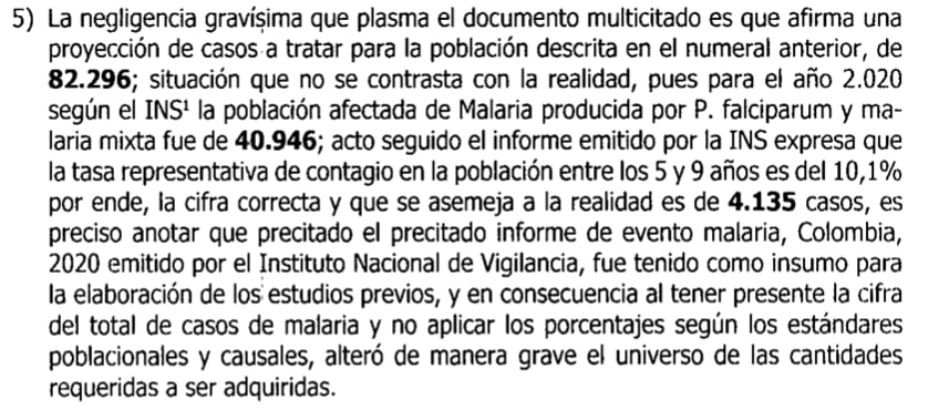 La denuncia, firmada por Rodolfo Salas en calidad de director jurídico del ministerio, explica que el secretario general del Ministerio de Salud liderado Fernando Ruiz, Lubin Burgos Bernal, celebró la contratación directa con la organización Panamericana de la Salud en marzo de 2021 por una estimación y necesidad de 2′145.000 medicamentos para tratar la Malaria.