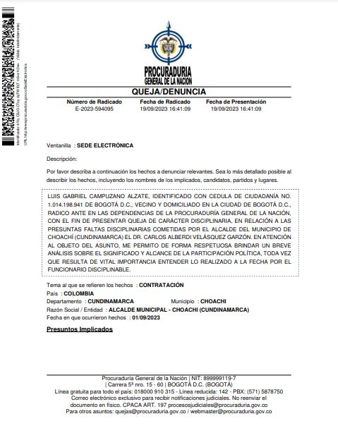 En Choachí, municipio de Cundinamarca, el pasado miércoles 27 de septiembre se materializó una denuncia directa hacía el alcalde, Carlos Alberdí Velsquez, quien ahora se encuentra bajo investigación de la Procuraduría General de la Nación debido a acusaciones por su presunta participación indebida en política en el contexto del proceso electoral actual.
