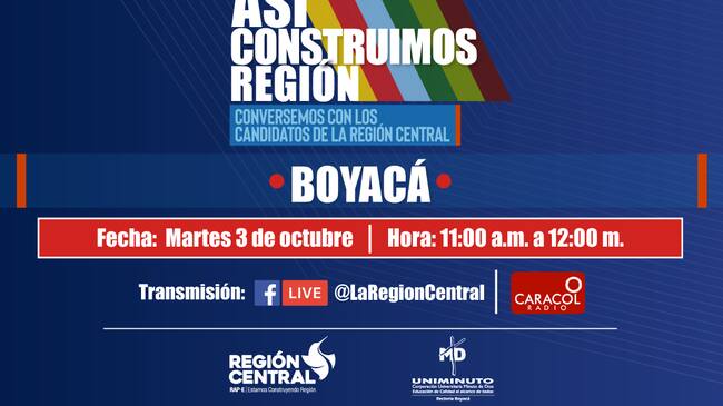 ‘Así Construimos Región’ es el nombre del diálogo con los siete candidatos a la Gobernación de Boyacá que se realizará por parte de la Región Administrativa y de Planeación Especial (RAP-E), en asocio con la Corporación Universitaria Minuto de Dios – Rectoría Cundinamarca - Boyacá, el próximo martes, 3 de octubre, de 11:00 a.m. a 12:00 p.m. Este encuentro se desarrollará en Tunja y será transmitido por las cuentas de Facebook: @LaRegionCentral y @CaracolRadio.