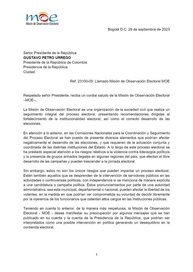 Por medio de una carta pública, con fecha del pasado 29 de septiembre, la directora de la entidad, Alejandra Barrios, envió un mensaje al propio presidente Petro para que apoye la transparencia de las elecciones a través del cuidado de sus mensajes en redes sociales.