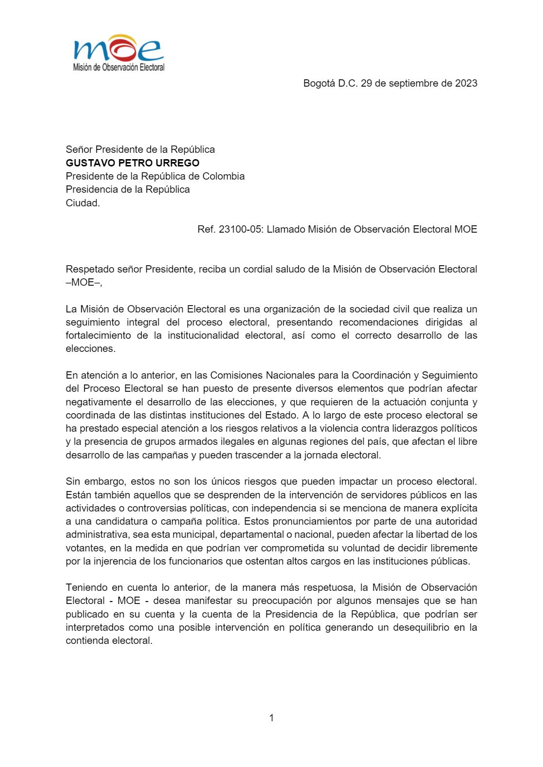 Carta de la Misión de Observación Electoral al presidente Gustavo Petro. Foto: MOE.