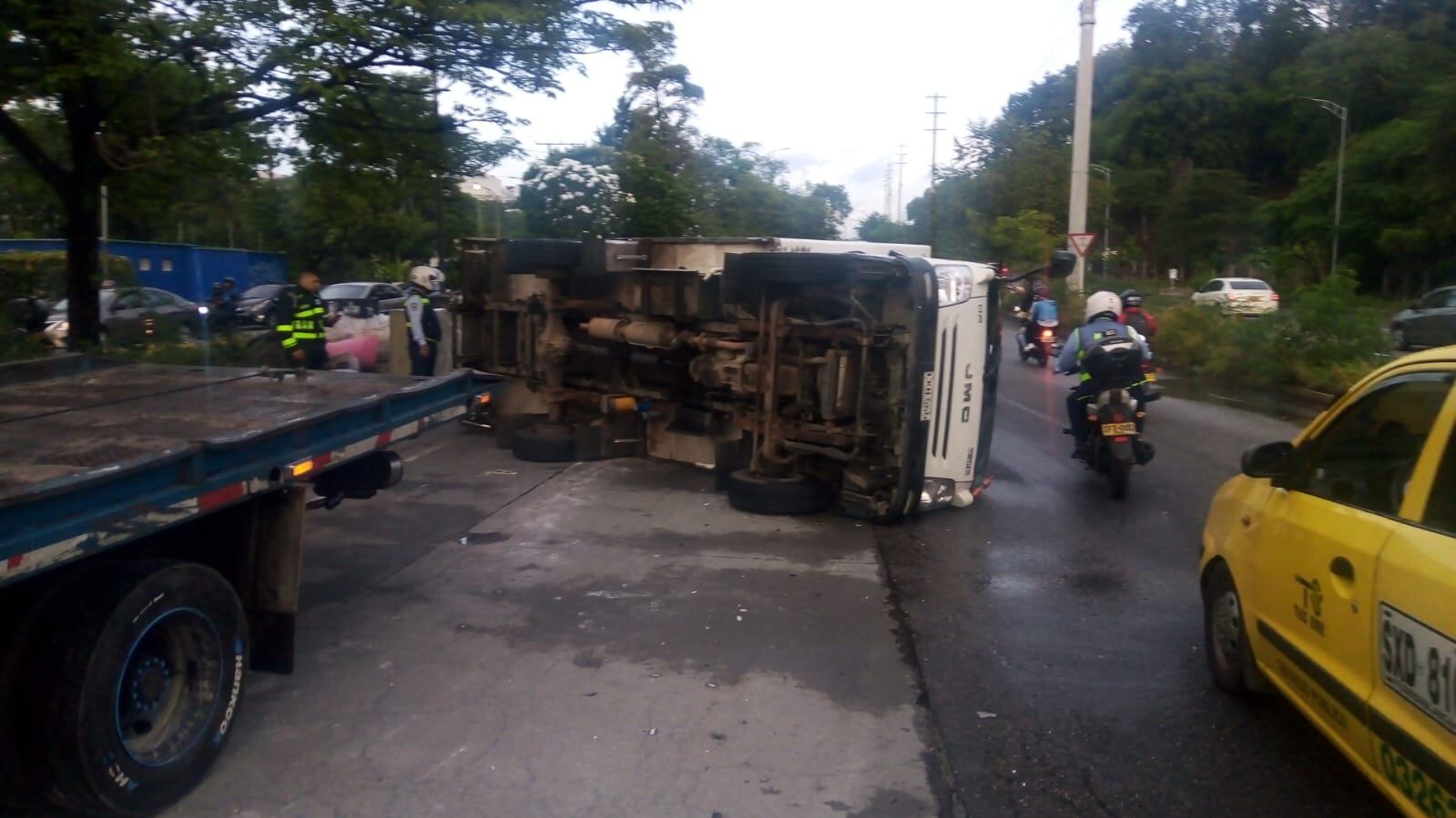 Conductores que transitan por la autopista Floridablanca - Bucaramanga frente a la estación de Metrolínea de Lagos reportan que por el volcamiento de un vehículo tipo turbo hay congestión vial.