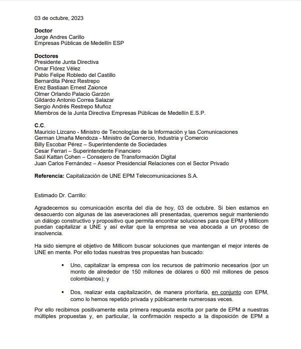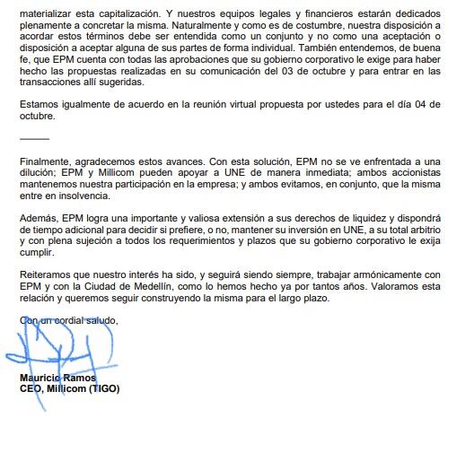 Una vez recibida la carta enviada por el CEO de Millicom Mauricio Ramos a EPM sobre las propuestas en las que concuerdan para poder capitalizar a Tigo.