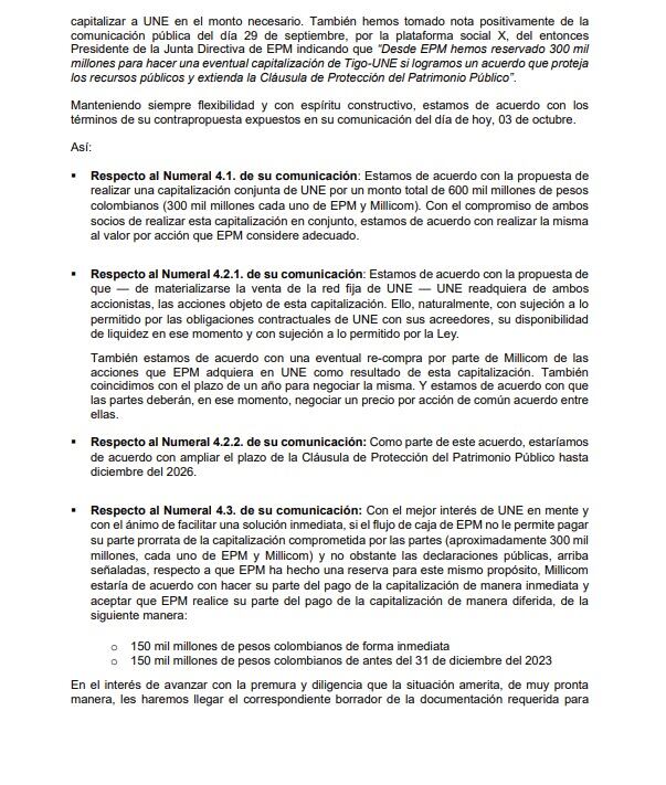 Finalmente propuso que, en caso de que EPM no cuente con el total de los $300 mil millones en caja como lo había indicado el exalcalde de Medellín Daniel Quintero de que ya habían separado esa cantidad, Millicom estaría de acuerdo con que se paguen 150 mil millones de pesos de manera inmediata y que el 50% restante se pague de manera diferida con plazo máximo a 31 de diciembre del 2023.
