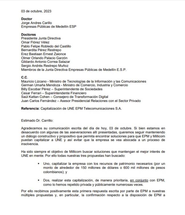 La compañía Millicon le respondió a EPM la carta sobre las propuestas hechas por la compañía de servicios públicos accionista de UNE para la capitalización de la empresa de telecomunicaciones.