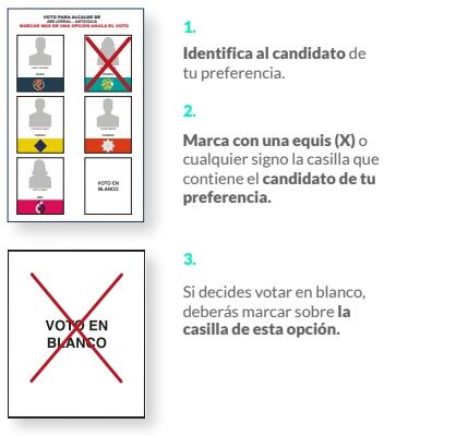 Al llegar al puesto de votación deberá pedir el tarjetón electoral de la autoridad local por la que vaya a votar. Lo primero que debe realizar es una breve identificación de los elementos como fotografías, nombres y logos de las agrupaciones políticas. Asimismo, se debe cerciorar que no tenga ninguna marca o tachón.