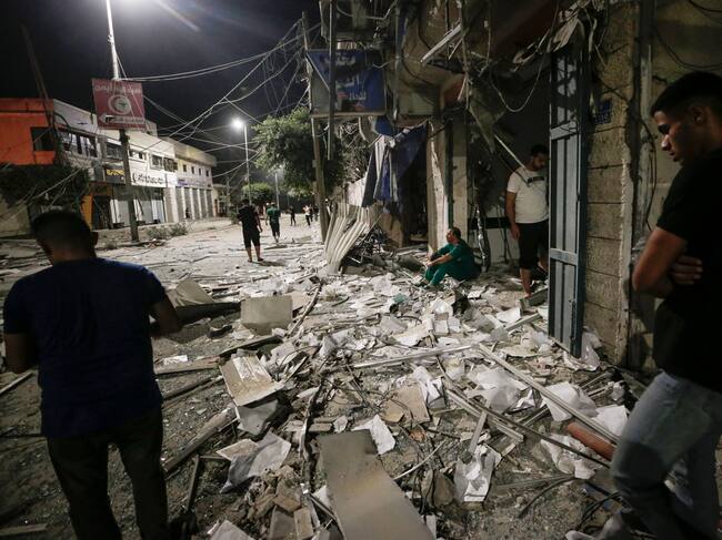 Gaza (---), 09/10/2023.- Palestinians look at the aftermath of an Israeli air strike on Gaza City, 09 October 2023. More than 700 Israelis were killed and over 2,000 were injured since the Islamist movement Hamas carried out an unprecedented attack on southern Israel on 07 October, the Israeli army said. According to Palestinian officials, more than 700 people were killed and nearly 4,000 were injured as a result of Israel'Äôs retaliatory raids and air strikes in the Palestinian enclave. (Laos) EFE/EPA/HAITHAM IMAD / HAITHAM IMAD (EFE)